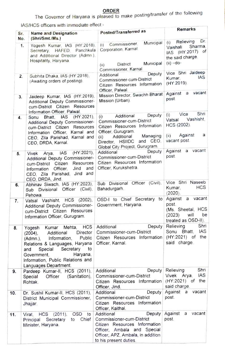 IAS अफसर योगेश कुमार को करनाल म्यूनिसिपल कापोर्रेशन का कमिश्नर लगाया गया है। सुभिता ढाका को पलवल का ADC लगाया गया है। वहीं HCS अधिकारी गौरव कुमार को स्टेट इलेक्शन कमीशन में सेक्रेटरी लगाया गया है।