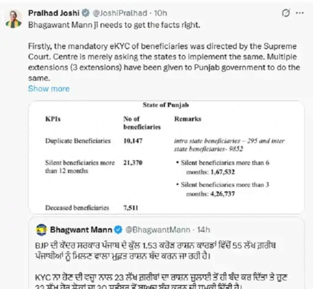 पंजाब में राशन कार्ड और eKYC को लेकर राजनीति तेज हो गई है। एक तरफ आम आदमी पार्टी (AAP) की सरकार केंद्र पर गरीबों का राशन बंद करने का आरोप लगा रही है, वहीं दूसरी ओर केंद्र सरकार का कहना है कि वह किसी का राशन बंद नहीं कर रही है, बल्कि यह प्रक्रिया सुप्रीम कोर्ट के आदेश के मुताबिक चल रही है।