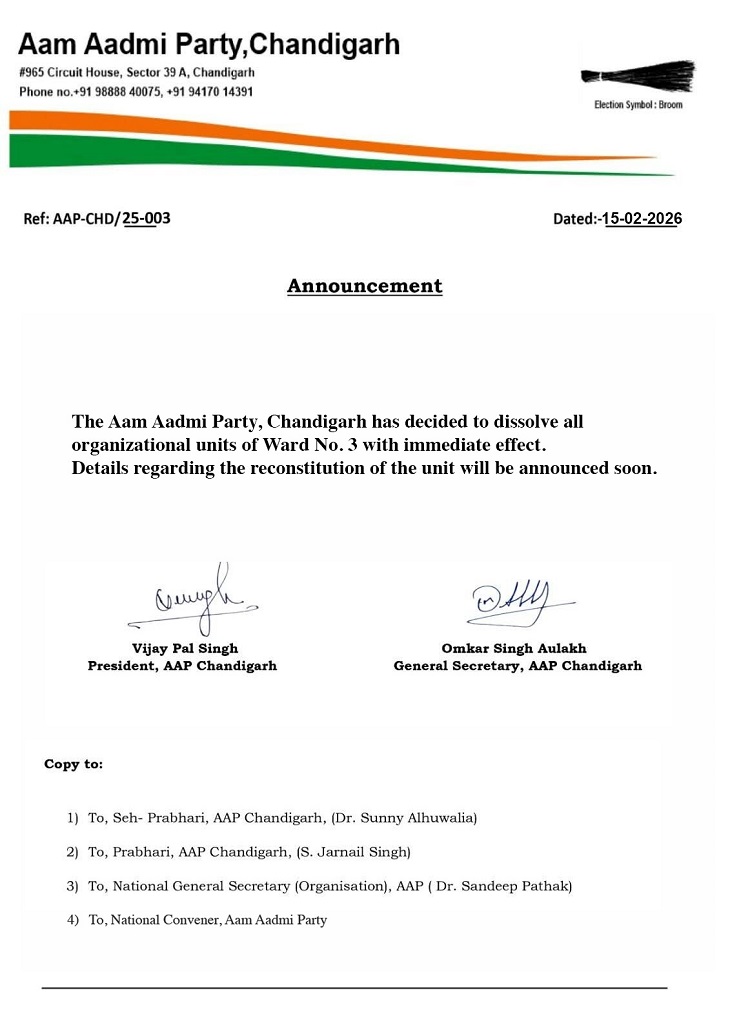 आम आदमी पार्टी चंडीगढ़ ने वार्ड नंबर 3 की सभी इकाइयों को तत्काल प्रभाव से भंग करने का निर्णय लिया है। पार्टी द्वारा जल्द ही नई संगठनात्मक संरचना की घोषणा की जाएगी। यह फैसला पार्टी प्रधान विजय कुमार तरफ से लिया गया है। इस संबंधी जानकारी पार्टी हाई कमान को भेज दी गई है। पत्र की कॉपी