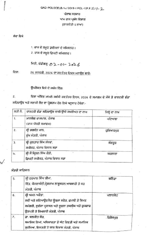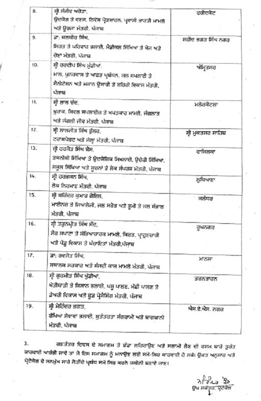 इसके साथ ही राज्य के सभी मंत्रियों की ड्यूटियां भी विभिन्न जिलों में लगाई गई हैं, ताकि समारोह शांतिपूर्ण और सुव्यवस्थित ढंग से संपन्न हो सके। गणतंत्र दिवस के अवसर पर राज्य भर में परेड, सांस्कृतिक कार्यक्रम और अन्य आयोजन किए जाएंगे। प्रशासन को निर्देश दिए गए हैं कि सुरक्षा व्यवस्था और आयोजन की सभी व्यवस्थाएं समय पर पूरी की जाए।